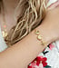 De goudkleurige bedels zijn groots aanwezig – en dat mag ook. Want deze armband mag gezien worden.