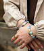 Er zijn drie verschillende armbandjes, los van elkaar verkrijgbaar, en elk met een eigen uitstraling. De armband met keramieken schelp en visje voelt als een kleine vondst van het strand. Alsof je ‘m ooit hebt meegenomen uit een kustplaats en sindsdien niet meer afdoet. Speels, licht en meteen een blikvanger.