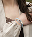 En tot slot de blauwe flexibele bangle. Strak, en ideaal om te combineren met de andere twee. Hij schuift makkelijk om je pols en geeft je armbanden-set meteen wat meer balans. Mooi alleen, maar ook heel fijn als basis waar je de andere armbandjes bij draagt.