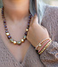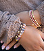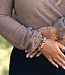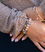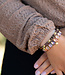 Soms begint het met één armband. Gewoon eentje. Maar voor je het weet, ben je allebei je polsen aan het inrichten alsof ze een festivalagenda zijn. Links draag je een driedubbele combinatie van kleine kralen in roze, goud en zacht parelmoer – lekker nonchalant, alsof je ze al jaren hebt. Rechts gaat het net wat harder: een crystal stenen -armband met bijna buitenaardse glans, naast een rustige tegenhanger van bruine kralen en goudkleurige accenten.