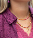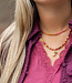 En dan de bovenste ketting: subtiel, fijntjes en toch perfect opvallend door de warme kleuren. Een echte allrounder die je los kunt dragen voor een minimal look, of juist combineren met andere sieraden voor een gezellige layered style. Samen vormen ze een gouden duo, maar het leuke is: ze worden apart verkocht. Zo kun je zelf mixen, matchen en je eigen stijl bepalen.