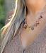 Hij begint met een speels geknoopt koord, wat hem meteen een nonchalante en natuurlijke uitstraling geeft. Geen strak, glanzend collier, maar een ketting die leeft. Alsof hij zelf een beetje meebeweegt met je dag. En dan de bedels… stuk voor stuk verrassingen die samen een vrolijk geheel vormen. Kleine natuursteen kralen in warme tinten, glinsterende accenten en natuurlijk dat gouden detail dat er subtiel uitspringt.