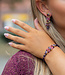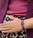 De eerste armband doet denken aan een sprookje uit 1001 nacht. Met zijn fonkelende steentjes en luxe uitstraling lijkt het net alsof je hem hebt gevonden op een oosterse bazaar, tussen kleurrijke stoffen en gouden lampen. De diepe paarse tinten worden afgewisseld met goudkleurige details, waardoor het een armband is die zowel glamour als warmte uitstraalt. Perfect voor een avond uit, maar net zo makkelijk te combineren met je favoriete trui of blouse.