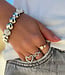 De combinatie van de gladde zilverkleurige schijfjes en de kleine glinsterende details maakt deze armband verrassend leuk. Het ene moment oogt hij rustig en minimalistisch, en het volgende moment zie je ineens die kleine fonkeling terugkomen. Een beetje zoals zon op water, maar dan gewoon om je pols.