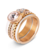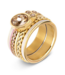 Deze samengestelde ring bestaat uit de goudkleurige 10mm brede basisring Warm Grey en is gevuld met de Vulring 'Rock Sand', Vulring Small Circle Stone Pink', Vulring 'Twisted' en de Vulring 'Line Pink'. Met deze vulringen kun je eindeloos wisselen en combineren.