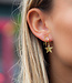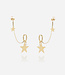 Dan het tweede paar: de oorbellen met een speels sterretje. Deze bestaan uit een oorknopje dat met een subtiel kettinkje verbonden is aan een kleine oorring. Daaraan bungelt een ster, alsof je een mini-galaxy om je oor hebt hangen. Het is een detail dat meteen opvalt, maar toch super draagbaar blijft. Ideaal voor dagelijks gebruik én om je earparty een originele twist te geven. Zie de fotos voor de verschillende draagopties.