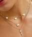 De bovenste ketting met platte witte steentjes is zo’n fijne basis die je overal bij draagt. Fris, rustig en toch nét even anders dan een standaard kettinkje. De witte details geven een zachte uitstraling en zorgen ervoor dat je outfit meteen wat lichter aanvoelt. Ideaal voor dagen waarop je het simpel wilt houden, maar wel verzorgd voor de dag wilt komen.