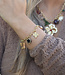 Er zijn armbanden die je gewoon vrolijk maken zodra je ze omdoet – en deze gouden schakelarmband hoort daar absoluut bij. Het is niet zomaar een armband, maar een klein feestje om je pols. Aan de schakels bungelen speelse bedels, zoals een cowboylaars (met een knipoog naar je inner cowgirl), een bloem die altijd in bloei staat en natuurlijk een hartje dat warmte uitstraalt.