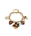 Deze schakelarmband met grote bruine resin bedels heeft het allemaal — een hart dat smelt, een bloem die bloeit en genoeg glans om zelfs de zon jaloers te maken. Daarnaast nog een muntje, een strikje en een klavertje, aan geluk geen gebrek dus.