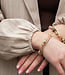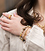 De combinatie van zachte beige, warm bruin en lichte accenten zorgt voor een rustige look met genoeg detail. De onderste armband is een dubbele armband. Hierdoor heb je meteen een trendy laagjes effect. Je hoeft dus niet zelf de match uit te zoeken— dat is al voor je gedaan. Ideaal voor dagen waarop je snel iets leuks om wilt doen. De armbanden bestaan uit kralen en natuur stenen in verschillende natuur tinten en bruin. Een goudkleurig armbandje erbij maakt het geheel compleet.