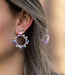 De oorbellen bestaan uit een vierkante roze steen bovenin, met daaronder een ronde ring omhuld met paars garen en versierd met kleurrijke kristalsteentjes in allerlei pastelkleuren. Het resultaat: een oorbel die er tegelijk feestelijk én luchtig uitziet.