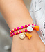 Sier je pols met deze unieke armbanden vol kleur en karakter! Beide armbandjes zijn voorzien van kralen in opvallende roze en oranje kleuren. De ene versie heeft een goudkleurig muntje (uitverkocht)als detail, terwijl de andere een zilveren muntje heeft, met wel allebei een vrolijk oranje kwastje voor nét dat beetje extra leuk.