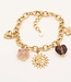 Soms heb je een armband die alles zegt zonder dat jij een woord hoeft te doen. Deze chunky gouden armband met bedels is er zo één. Elke bedel heeft zijn eigen karakter: een stralende zon die je dag oplicht, een romantisch hart, een bloem die je doet denken aan zomeravonden en een charmante klaver die gewoon geluk belooft. Samen vormen ze een mini-verhaal om je pols.