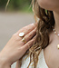 De eerste ring is groots, rond en gemaakt om op te vallen. De glanzende schelp inleg geeft je dat zomerse beach gevoel – zelfs op een druilerige dinsdag. Door de zachte parelmoertinten en de gouden omlijsting oogt deze ring chic, maar nooit overdreven. Denk: stijlvol, fris, en altijd draagbaar.