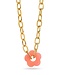 De ketting is goudkleurig met grove schakels – lekker stoer – maar die roze bloem in het midden maakt ’m zacht en speels. Alsof je hals zegt: “Ik ben cool, maar ook cute.” De hanger heeft precies de juiste kleur roze om op te vallen zónder te schreeuwen. Denk: bubblegum-chic, of ‘blush met ballen’.