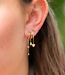 Aan de goudkleurige creool bungelen drie verschillende bedels: een fonkelend druppelsteentje, een lief hartje en een sterretje dat zorgt voor een speelse sparkle. Een mini galaxy aan je oor dus. De mix van symbolen geeft deze oorbel een eigenwijs karakter – perfect voor wie niet wil kiezen tussen romantisch en stoer.